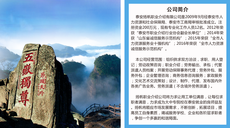 泰安揚(yáng)帆職業(yè)介紹有限公司是2009年9月經(jīng)泰安市人力資源和社會(huì)保障局、泰安市工商局審核批準(zhǔn)成立。注冊資金200萬元,現(xiàn)有專業(yè)化工作人員12名。2012年榮獲“泰安市職業(yè)介紹行業(yè)協(xié)會(huì)副會(huì)長單位”;2014年榮獲“山東省誠信服務(wù)示范機(jī)構(gòu)”;2015年榮獲“全市人力資源服務(wù)業(yè)十強(qiáng)機(jī)構(gòu)”;2016年榮獲“全市人力資源誠信服務(wù)示范機(jī)構(gòu)”。